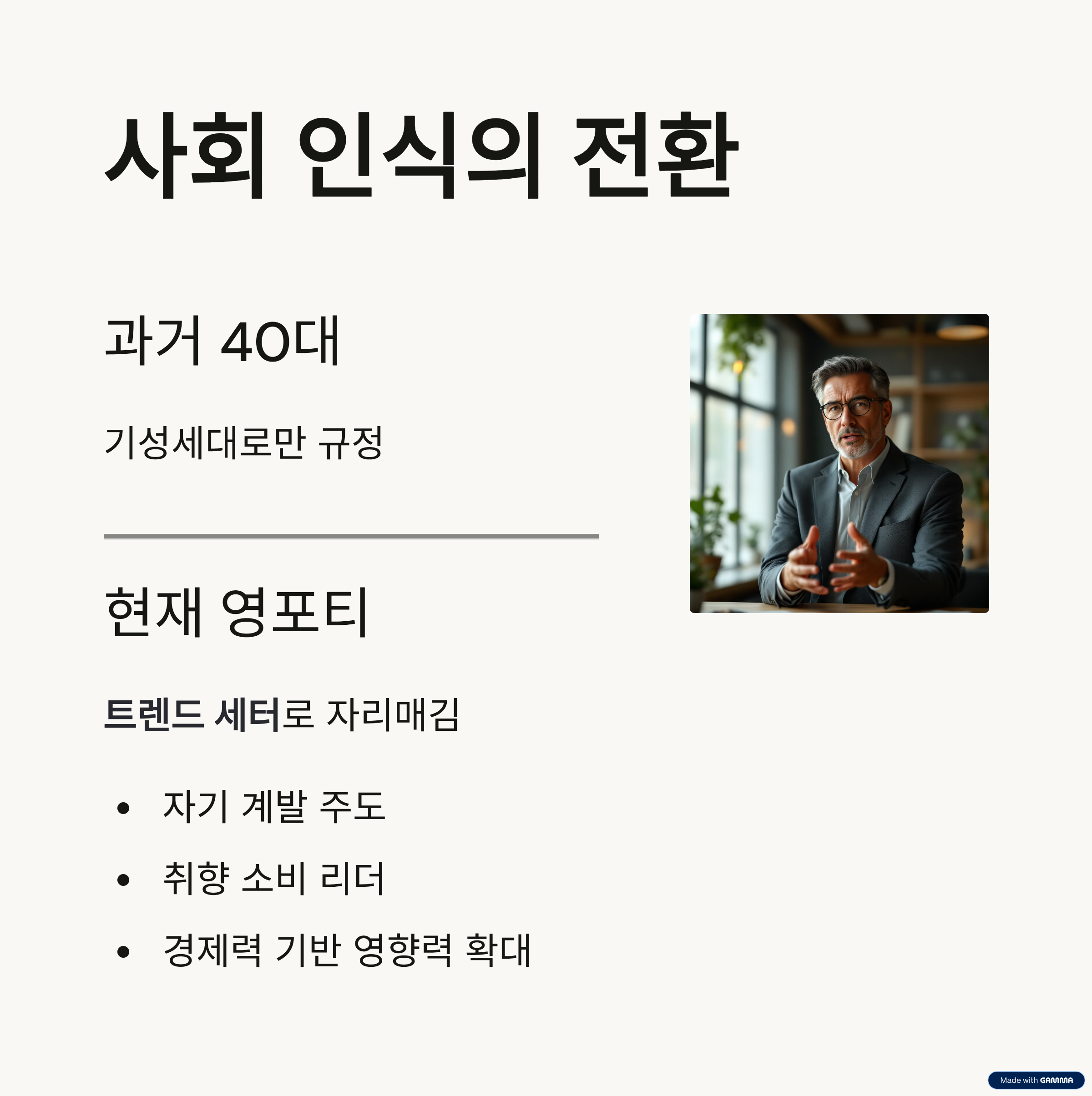 즉, 영포티는 40대를 전통적 이미지가 아닌 ‘능동적 소비자이자 문화 창조자’로 재정의합니다.