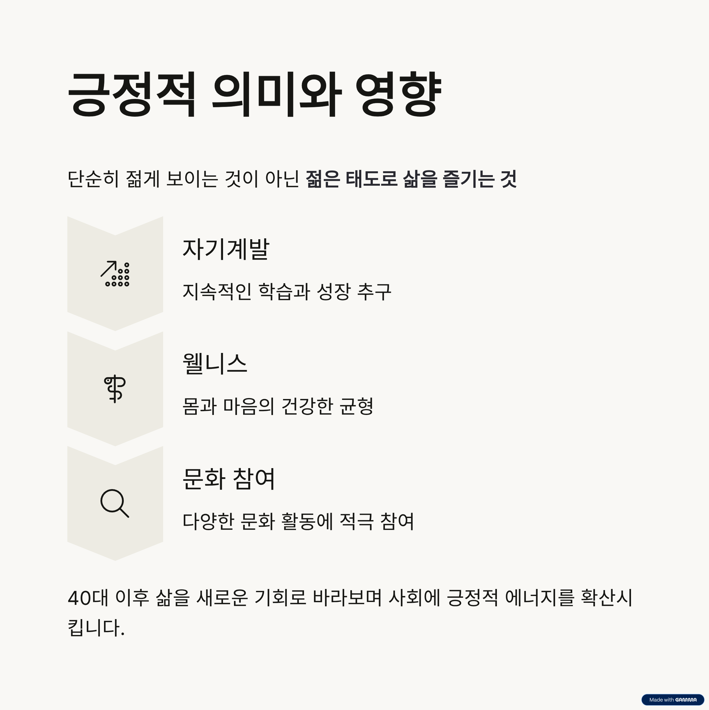 이런 태도는 40대 이후의 삶을 새로운 기회(Entity: Opportunity)로 바라보게 하며, 사회 전반적으로 긍정적 에너지를 확산시키고 있습니다.